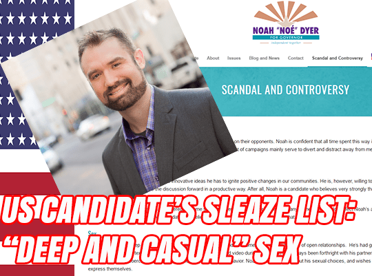It’s the age of golden shower kompromat. You’re a political candidate fighting a tough election campaign. What keeps you awake at night? The fear that all your past sexual misadventures will be exposed, of course. It’s Guido’s mission to bring them to light… Noah Dyer, running for governor of Arizona in 2018, is taking a novel approach to … Continue reading US Candidate Publishes “Scandal” List Confessing To “Deep and Casual” Sex